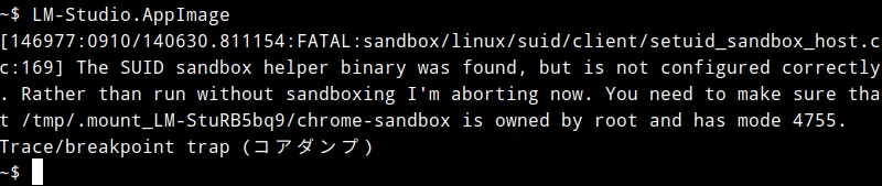 CursorやLM StudioなどのアプリをUbuntuにダウンロードしてchmod +x (あるいはchmod a+x)で実行権を付与しただけでは、以下のようなエラーが発生して動きませんでした。