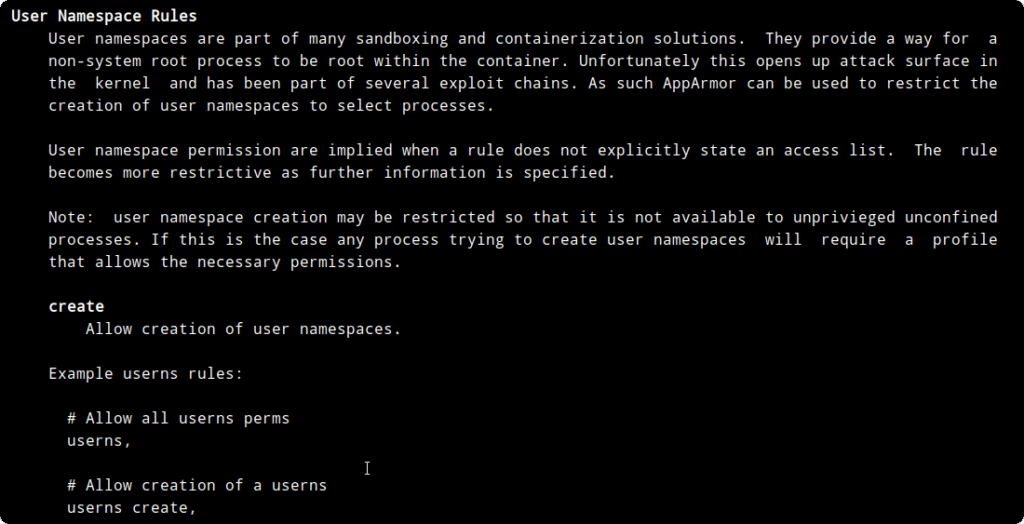 sudo sysctl -w kernel.apparmor_restrict_unprivileged_userns=1AppArmorのプロファイルの構文はmanコマンドで確認できる